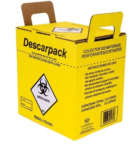 Caixa coletora para descarte seguro de materiais perfurocortantes como agulhas, lâminas, ampolas e outros objetos contaminantes.